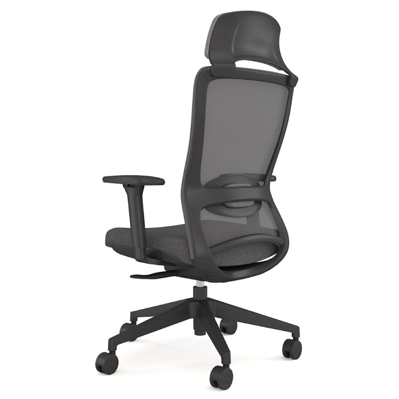 Silla Ejecutiva, mecanismo autopesante, deslizador de asiento y fijación de reclinación en 3 posiciones. Respaldo de malla con soporte lumbar ajustable en altura y apoya cabeza fijo. Asiento de espuma inyectada tapizado en tela, con apoyabrazos ajustables en altura, ángulo y profundidad (3D) con superficien en PU. Gas de 120 mm., base de nylon negro y ruedas PU reforzado de 60 mm.