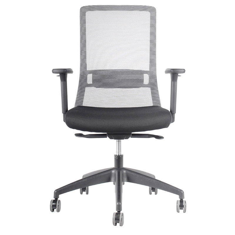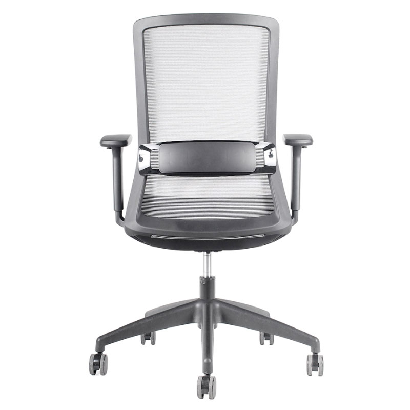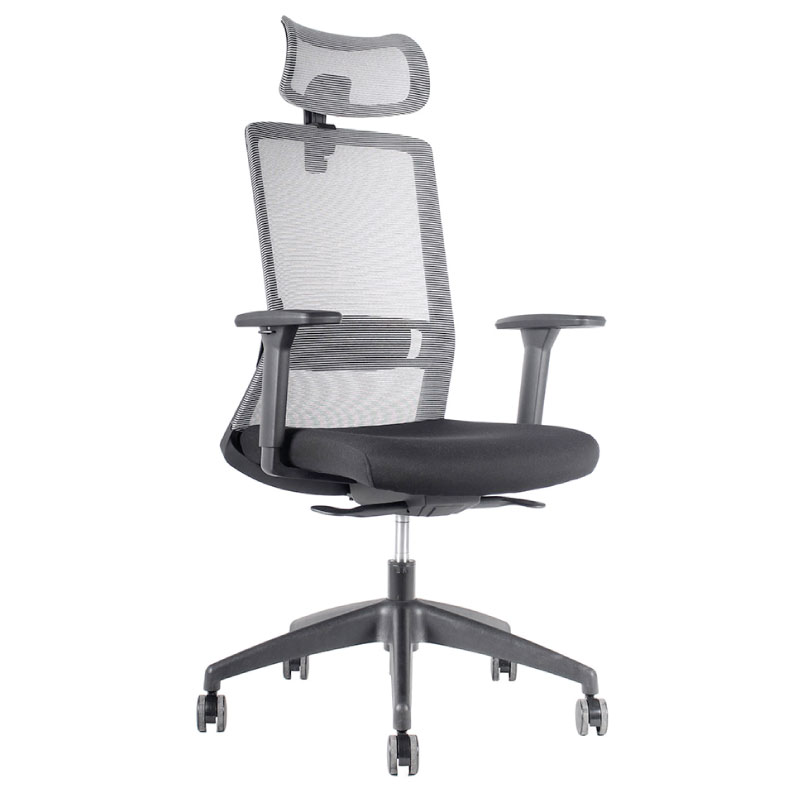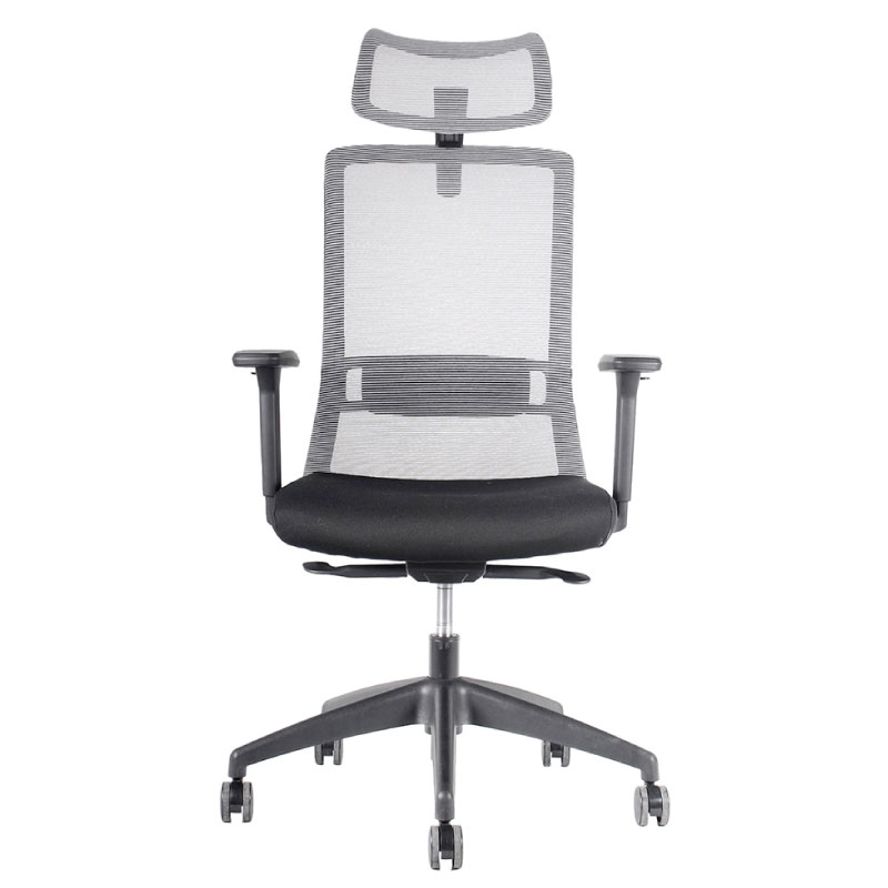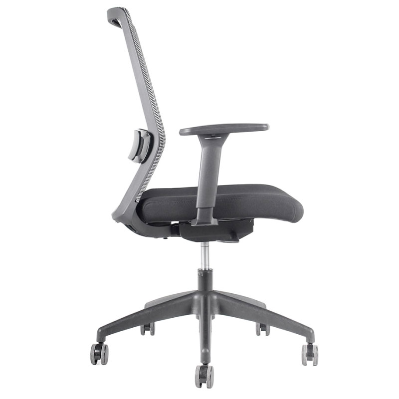 Silla Operativa, mecanismo sincrónico deslizador de asiento y fijación en 4 posiciones de bloqueo y sistema de tensión autopesante. Respaldo de malla negra o gris con soporte lumbar regulable en altura. Apoyabrazos en PU ajustable en altura, ángulo, ancho y profundidad (4D) Asiento de espuma inyectada tapizado en negro, gas de 120 mm., base de nylon de 660 mm. y ruedas en PU negro de 60 mm. *Opcion : Apoya cabeza negro o gris en malla, regulable en altura y ángulo.